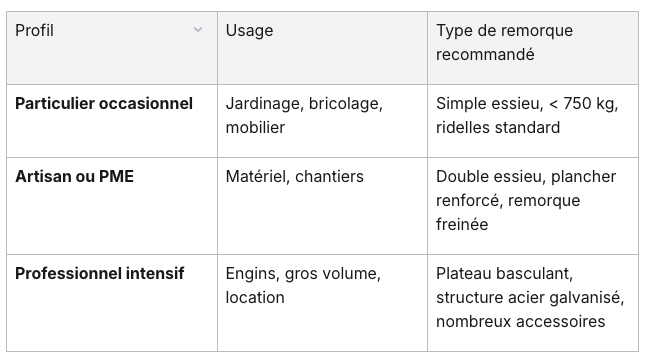 Plus l’usage est intensif, plus il faudra viser une remorque robuste, avec essieu renforcé, plancher solide et accessoires adaptés (bâche, ridelles amovibles, roue jockey…).