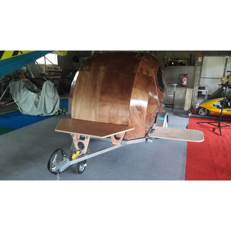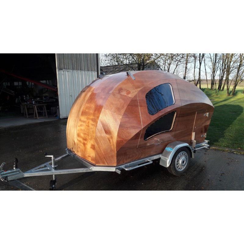 Caravane Teardrop ossature bois , châssis galvanisé chambre 2 personnes avec ouvertures latérale.
